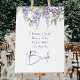 Choose A Seat Not A Side Mrs & Mrs Wedding Ceremony Sign features elegant watercolor purple wisteria flowers on a white background with the text "Choose a seat not a side either way it's for a bride" in elegant purple handwritten calligraphy script typography. Perfect for the entrance to your wedding ceremony. Designed for you by ©Evco Studio www.zazzle.com/store/evcostudio
