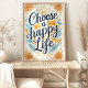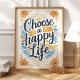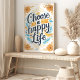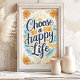 Radiate positivity with this vibrant "Choose a Happy Life" art print. The hand-lettered quote takes center stage, surrounded by cheerful yellow florals and a glowing sun, evoking warmth and optimism. The blue accents add a touch of tranquility, creating a balanced and uplifting design. Perfect for adding a burst of sunshine to any room.