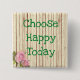 Choose Happy Positive Quote Simple Button with rustic wood background and pretty pink rose
