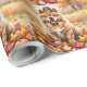 A watercolor-style painting of a cheerful dog sitting amidst a pile of vibrant fall leaves, surrounded by tiny pumpkins and scattered acorns. The dog wears a little pilgrim hat and beams with joy, capturing the spirit of Thanksgiving. In the background, soft harvest fields and golden-hued trees create a peaceful countryside ambiance. Gentle textures and warm, muted autumn tones give the scene a cozy, nostalgic feel perfect for celebrating the beauty of the season.