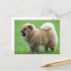 This fun canine postcard features a cream tan Chow Chow puppy sticking out her tongue in greeting highlighted against a green grassy background. The back of the card is blank for your personal message.