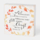 Bible verse from Romans 5:8 " But God demonstrates his own love for us in this: While we were still sinners, Christ died for us." featuring watercolor fall leaves foliage wreath wood box art.