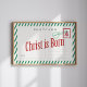 Vintage-style Christmas postcard poster featuring the bold phrase “Christ is Born” with festive holiday stamp and green diagonal stripes. Perfect Christian holiday wall art for home or church decor.