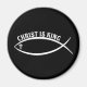 "Jesus Fish" (otherwise known as the Ichthys), which has a cross for an eye. Text above reads "Christ Is King".