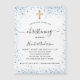A modern, elegant baptism, celebrating a baby boy. White background decorated with blue faux glitter sparkles and a golden cross. Personalize and add a name and party details. Black colored letters.