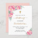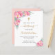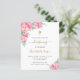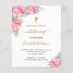 A white background decorated with pink florals. Personalize and the childs name and ceremony details. Black and golden colored letters.
