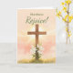 A glowing sunrise radiates behind a wooden cross while white lilies bloom beneath it, symbolizing renewal and Resurrection hope. The uplifting proclamation Rejoice celebrates Easter morning in a soft watercolor style. This customizable Christian greeting allows you to add a special name, creating a personal and meaningful way to share faith filled Easter blessings.