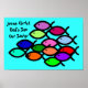 A school of Christian fish symbols in rainbow colors all swimming in one direction united with one purpose.
