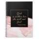 Elegant pink, black, and gold custom spiral notebook with the Christian Bible verse Psalm 46:5: God is within her. She will not fail. The front of this notebook has plenty of space to add a name or any other text you choose. Contact me for assistance with your customizations or to request additional matching or coordinating Zazzle products.
