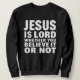This bold Christian design declares a powerful truth: “Jesus Is Lord, Whether You Believe It or Not.” With strong typography and a confident message, this shirt is perfect for believers who want to share their faith with clarity and conviction. Ideal for everyday wear, church events, outreach, or as a meaningful Christian gift.