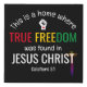 Modern Christian Juneteenth TRUE FREEDOM IN JESUS Faux Canvas Print which proudly declares THIS IS A HOME WHERE TRUE FREEDOM WAS FOUND IN JESUS CHRIST. Based on the Bible verse from Galatians 5:1. The Scripture verse is CUSTOMIZABLE so you can replace with your name, house name or short welcome message.