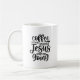 Simple, stylish Christian Mug that reads "Coffee Gets Me Started Jesus Keeps Me Going" in modern minimalist typography in off black. This trendy, modern faith design is the perfect gift and fashion statement. | #christian #religion #scripture #faith #bible #jesus #bethelight