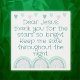 Monogrammed for you to insert your own prayer if you so choose, metal print. This cute boho theme with green rainbows and hearts, and green text on a white background, states, Dear Jesus, thank you for the stars so bright. Keep me safe throughout the night.