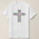 This religious word art / subway art design features words associated with Christianity arranged into the shape of a cross. Words include: God, Jesus, Christian, Bible, faith, love, peace, kindness, salvation, spiritual, Commandments, righteous, compassion, scripture, disciples, Christ, lamb, good, hope, truth, pray, Heaven, savior, worship, passion, gospel, charity, pure, holy, joy, Lord, verse, church, miracle, belief, bless, grace, glory, will, spirit, angels, trinity, and cross.