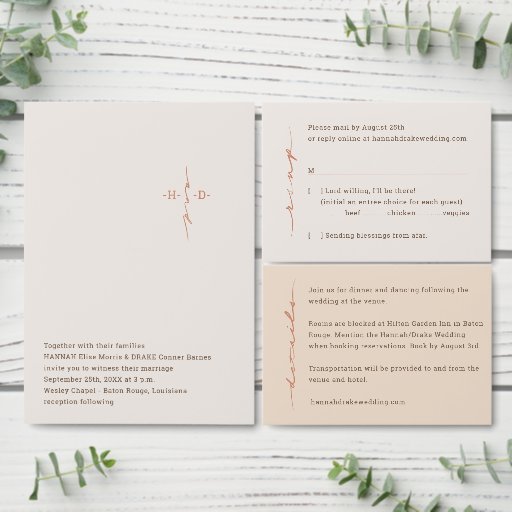 The clean, text-forward layout pairs a timeless slab serif font with elegant script accents, set in a warm neutral palette of cocoa brown, terracotta, warm blush, sand, and linen. Script elements are color-customizable, allowing you to tailor the design to your wedding palette while maintaining its signature style.