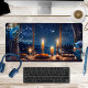 Desk mat featuring a magical design with candles and light sparkles overlooking a night scene with moon. Beautiful for Christmas and magical for any time of year.