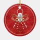 A Christmas theme graphic design of a gold filigree angel with pearls holding a heart with the message 'Joy' on a red chenille background.