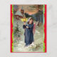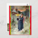 vintage painting of a christmas angel carrying a lantern outside at a snow covered village with cute country cottage and forest.