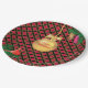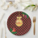 Christmas golden ball, pine cones and cardinal bird on black, golden and red checkered background Party Paper Plate. There is more to this design than meets the eye.