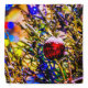 Christmas tree and red ornament ball covered with fresh snow. Colorful light around. Cheerful and joyful mood. Merry Christmas And Happy New Year. Season's greetings. Prints and gifts for anyone for fun and good mood. Square format products and souvenirs.
