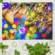 Christmas tree and red ornament ball covered with fresh snow. Colorful light around. Cheerful and joyful mood. Merry Christmas And Happy New Year. Season's greetings. Prints and gifts for anyone for fun and good mood. Horizontal or landscape oriented products and souvenirs.