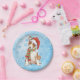 Celebrate the holiday season with a cute Basenji puppy wearing a Santa hat and scarf surrounded by snowflakes and with the words, Happy Howlidays!