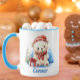 Make the holidays extra cozy with this personalized Christmas bear mug! Featuring a sweet watercolor bear in a red hat and scarf, holding a gift in a snowy forest scene, this festive mug includes your child’s name in a soft blue font. Perfect for hot cocoa on chilly mornings, this custom mug makes a heartwarming gift for toddlers, kids, or grandkids. A charming addition to stockings, Christmas Eve boxes, or festive gift sets.