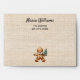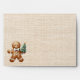 Beige faux burlap as background. Personalize and add a name and your return address. The name is written with a modern and trendy handlettered style script. Decorated with a happy smiling gingerbread man holding a Christmas tree.
