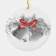 This ceramic ornament is shown with a festive Christmas holiday silver bells print.