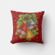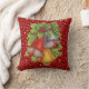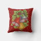 Christmas pillow with large, bright Christmas bells in red, blue, and gold on holly and berries.