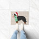 Festive Christmas Holiday Bernese Mountain Dog dressed in santa hat and green and white scarf holding red polka dot christmas ornament in its mouth. Cute christmas doormat for berner lovers!
