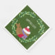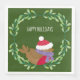 This adorable little bird is wearing his red holiday hat and purple scarf. He's sitting on green holiday branches with red berries. You can change the background color and customize the text.