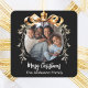 Black background. Personalize and add your own photo. A golden Christmas tree bauble as frame. Add your family name.