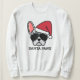 Join in the festive fun with this cute Christmas sweatshirt. The design features a blue merle colored french bulldog wearing a red Santa hat and aviator sunglasses with the wording "Santa Paws" printed underneath.