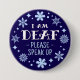 Let people know about your medical needs with this festive badge by JessicaAmber. This button features the slogan 'I am deaf. Please speak up." The border features some beautiful snowflakes, over a blue background. You can edit the text as needed, and all the colors, in the Zazzle editor. A great accessory for visiting family members during the holidays. ❄ For more deafness pins, visit my store Zazzle.com/Elder_Vitality ❄ For custom orders, message me on Zazzle