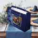 A navy blue background. Decorated with snowflakes. Personalize and add your name(s). Blue text.