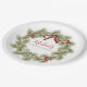 This design features a Christmas greenery holiday leaves wreath paper plate with a watercolor green and red foliage, botanical simple pine branches branch, classic red holly berries berry, stylish trendy calligraphy script font, simple block style lettering text, Christmas holiday party paper supplies, traditional circle round party decor, simple minimalist elegant classy, custom customized personalized name