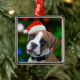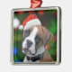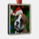 Fawn and white boxer dog wears a too small Santa hat and looks cute with bright Christmas lights in the background dog lovers Christmas holiday ornament
