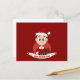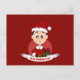 Postcard with an illustration of a cute smiling happy black-haired boy, he is wearing red and white Santa Claus costume and holding a present; with editable text template for your name or message, Christmas holidays design with a red background