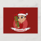 Postcard with an illustration of a cute smiling happy toddler boy, he is wearing red and white Santa Claus costume and holding a present; with editable text template for your name or message, Christmas holidays design with a red background