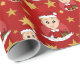 Christmas wrapping paper with an illustration of a cute smiling happy blond-haired boy, he is wearing red and white Santa Claus costume and holding a present; with editable text template for your name or message, Christmas holidays design with a seamless red background with stars