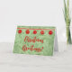 Original digital artwork featuring a background of Christmas Tree Pine branches, recreated into a light green toned background. The addition of a garland of red vintage style ornaments is draped across the top of the image. The front of the card states "Christmas Greetings!" and the inside of the card states "Wishing you and yours peace and joy this Christmas season! Merry Christmas!". There is plenty of room to add your own personal note as well. This pretty and joyful card would brighten up anyone's season, especially those who enjoy traditional green and red designs.