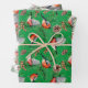 Festive holiday gift wrap features red bullfinch birds with pine cones and evergreen branches on three different background colors (white, green and gray)