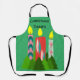 This apron has a Christmas design of candles made of rectangles decorated with stars, ovals, or diamonds with trees grouped around the bottom.