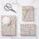 All 3 wrapping paper sheets are red and pastel pink candy canes on a green paisley textured background with caramel bits.