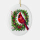 This ceramic Christmas ornament is shown with a festive cardinal on a wreath art print.
