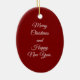 Lovely, vintage picture of a cardinal, sitting on a holly bush, is featured on this ceramic oval ornament for the Holidays. Front of ornament has a picture of the cardinal and back of the ornament reads, "Merry Christmas and Happy New Year", in white lettering on a red background. Use on your tree or give as a gift to cardinal and vintage fans too!