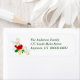 A Christmas return address label featuring a stylized red cardinal sitting on a sprig of holly with pine branches and golden swirls on the left margin.