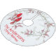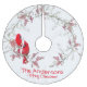 This Christmas tree skirt features two red cardinals sitting on berry branches in snow. Personalizable greeting and family name.
