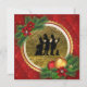 Vintage Victorian Christmas Caroling Party Invitations in classic red, green and gold holiday colors- Silhouette of old fashioned carolers singing in the snow with a dog against an elegant, faux gold foil look background. Framed with traditional pine boughs decorated with poinsettias and red and gold Christmas tree ornaments. Bordered with red, quilted look background sprinkled with faux gold sparkles. Back reads 'You're Invited to a Christmas Caroling Party' at the top in Art Deco style lettering with a shadow effect. Faux gold glitter stars on back with coordinating, solid gold color and custom text templates for your Victorian theme Christmas party. Note: All images are printed. Not actual glitter or foil. Create your own personalized, vintage Christmas party design.